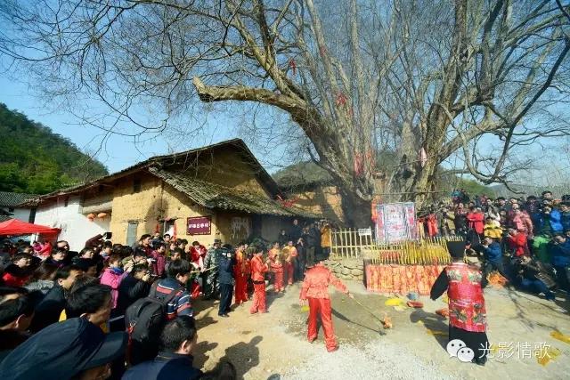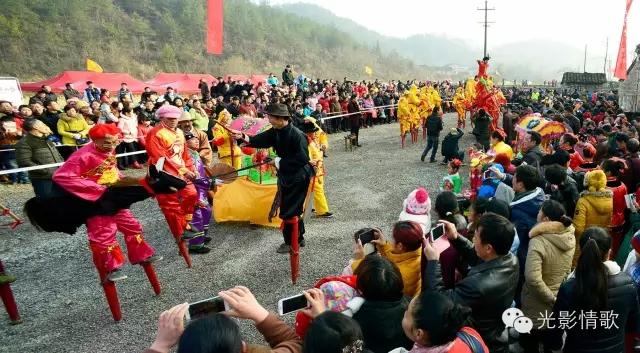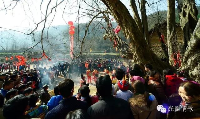 这天清晨,东方已开始放亮,无数的星星似乎感知到了古村落的节日味道,还在天空上一闪一闪地眨着眼睛,依依不舍,久久不肯离去。杀猪宰羊声在村落时时响起,并在山谷间久久回荡;熬腊八粥、烧浆点豆腐、炸爆米花的缕缕炊烟,从一棵棵古树旁的老宅升起;绿色年货的展销棚,在路边接连撑起;踩高跷、舞龙灯、跳秧歌的队伍,以及人流、车流,渐渐向秦家老屋主场地汇集。