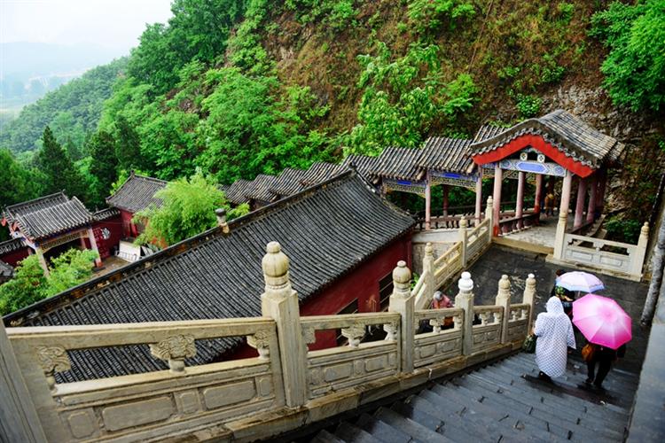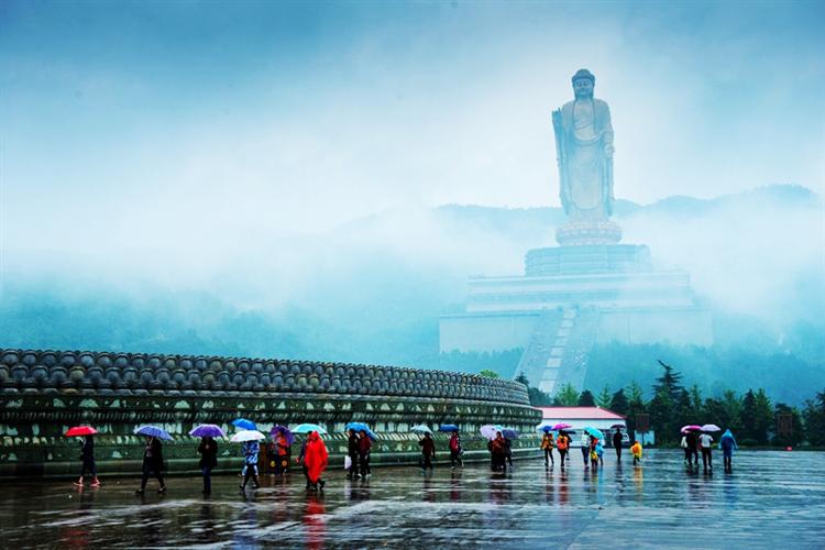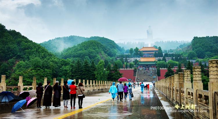 青山隐隐,烟雾迷离,一场连绵的雨,突如其来,把尧山冲洗得澄澈清明,中原第一大佛在阴雨迷蒙青烟缭绕里,如腾云驾雾一般,俯瞰众生。