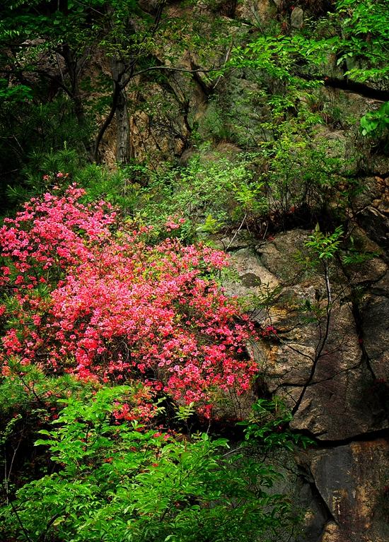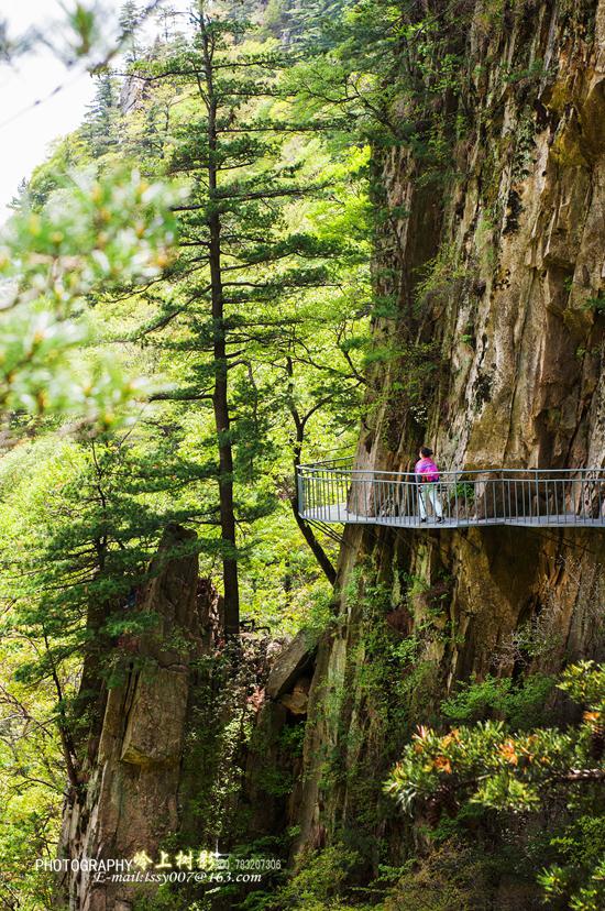 从西观景台左转,一条数百米悠长的悬空栈道,凭空缠绕在半山腰上,走上去,忽悠乱颤,一步一顿,让人惊出一身冷汗。一簇簇高山野杜鹃,嵌在悬崖上,正凌风傲寒,花开烂漫。提心吊胆地走过了回头再望,忽然觉得人生里许多的沟坎,原以为是天高地阔般无法逾越,其实,只要过去了,就是人生里一段最美的景致,最深的留恋。