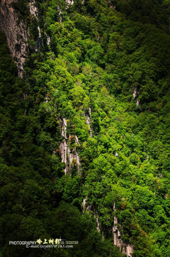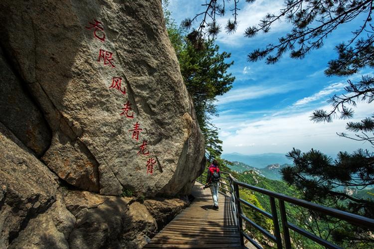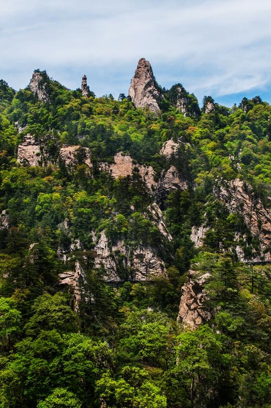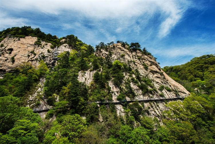 一脚踏进尧山,便踏进了大片的原始林海。这些高大蓬勃的乔木,参差着低矮茂密的灌木,有如一袭绿色的纱缦,笼罩住了整座尧山。从白牛城口到西观景台的1500米步道,完全被树木遮掩得只有一线云天的缝隙。