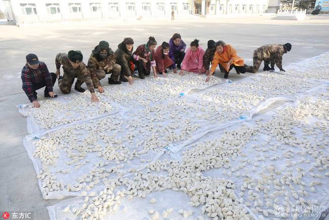 图为几名志愿者正在和战士们一起摆放水饺,在零下30多度的天然冰窖中进行速冻。 每逢过年过节,黑河市人民群众都会自发地来到部队给战士们义务包饺子、做年夜饭、送鞋垫等。