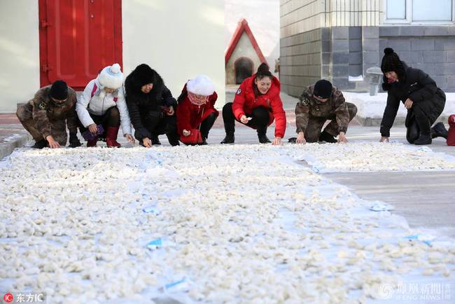 三个小时过后,她们就包了数以万计的饺子,由于饺子太多,为方便储存,战士们将饺子端到零下30多度的室外“天然冰窖”里冷冻,短短半个小时后,秒变“速冻水饺”。