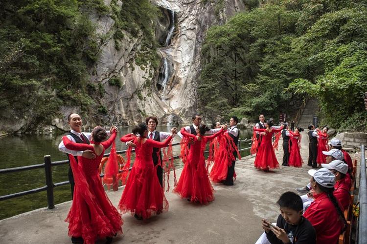 同时,在山门之前,山水之间,千米之上,尧山之巅,来自河南各地的二十余组千余名广场舞参赛选手身着各色服装齐聚尧山,用饱满的热情、甜美的笑容、优美的舞姿和层次分明的韵律美感,点燃了尧山的丰收热情。