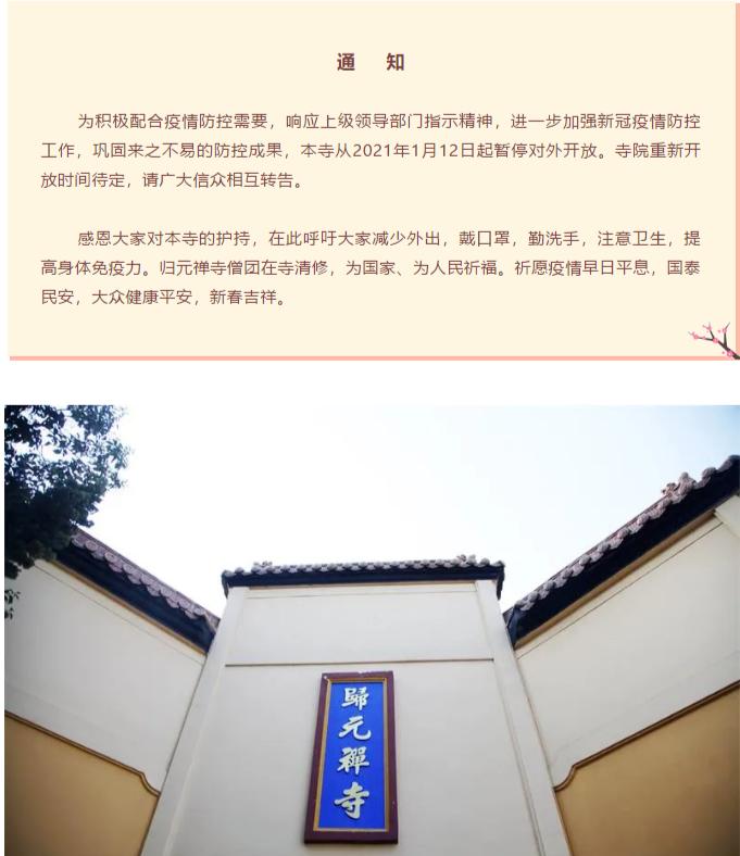 为积极配合疫情防控需要,响应上级领导部门指示精神,进一步加强新冠疫情防控工作,巩固来之不易的防控成果,武汉归元禅寺从2021年1月12日起暂停对外开放,寺院重新开放时间待定。