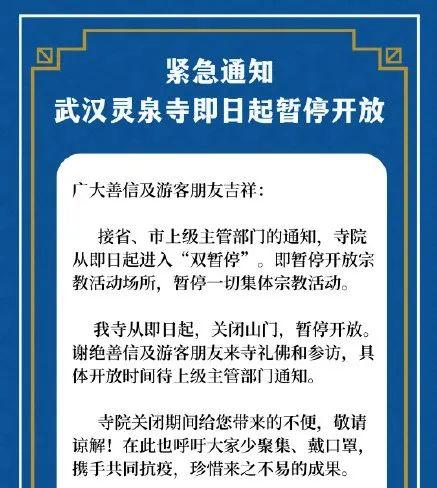 一、原则上从即日起至2月底前暂停开放宗教活动场所,暂停集体宗教活动。宗教场所具体开放时间另行通知,联系电话:0719—5665396。