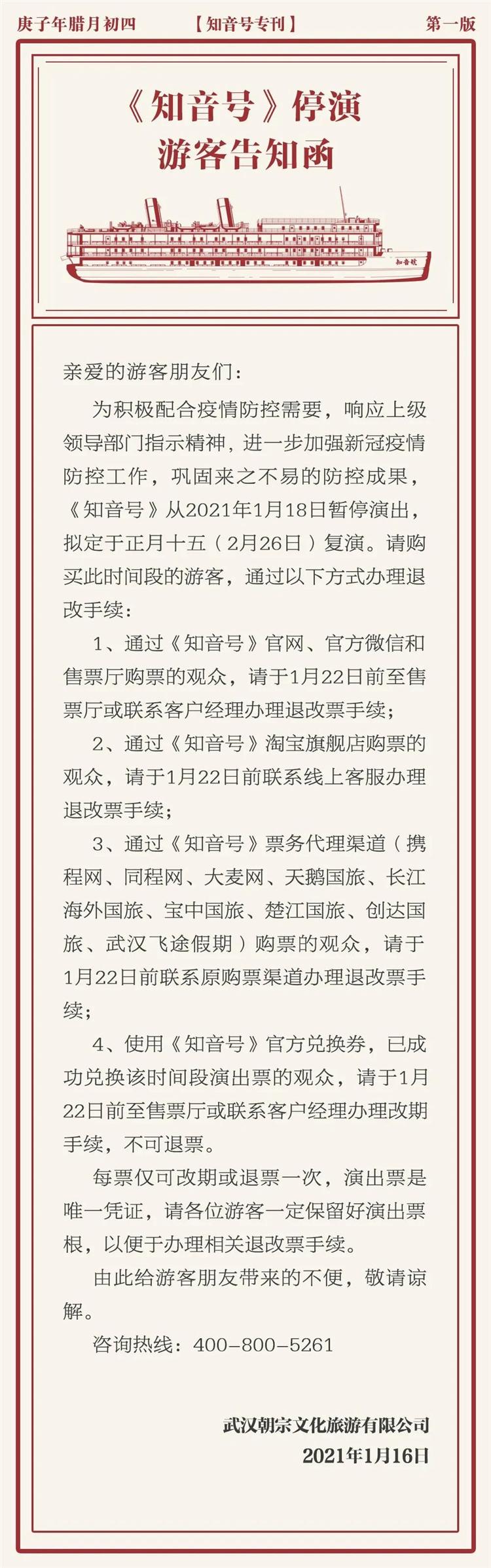武汉人民艺术剧院1月15日发布了“部分演出项目停演公告”。公告说,为进一步落实武汉市新冠疫情防控工作的要求,全力做好防控工作,切实保障广大观众和市民的身体健康与生命安全,原定于2021年1月15日至31日在武汉人艺中南剧场进行的演出停演,通过大麦网及其他票务渠道购票的观众,请根据各票务平台的具体流程规则,进行退票退款。因停演造成的不便,敬请谅解。