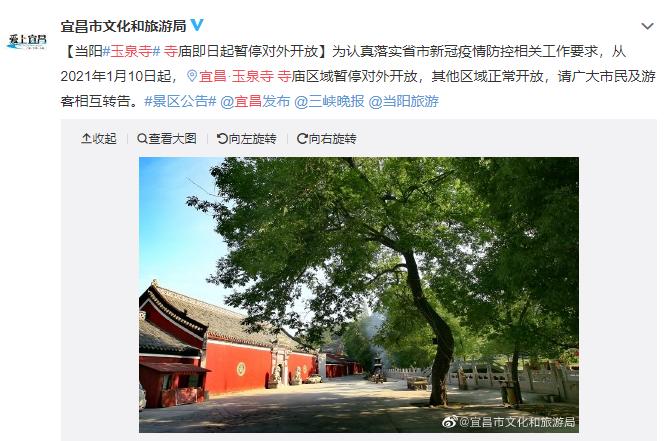 为认真落实省市新冠疫情防控相关工作要求,从2021年1月10日起,宜昌玉泉寺寺庙区域暂停对外开放,其他区域正常开放,请广大市民及游客相互转告。