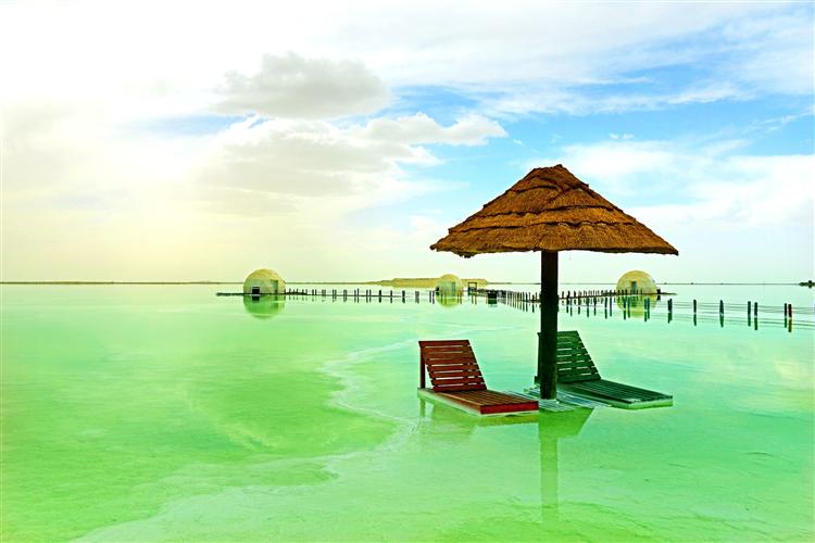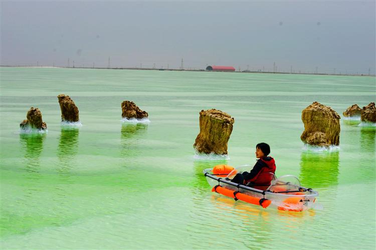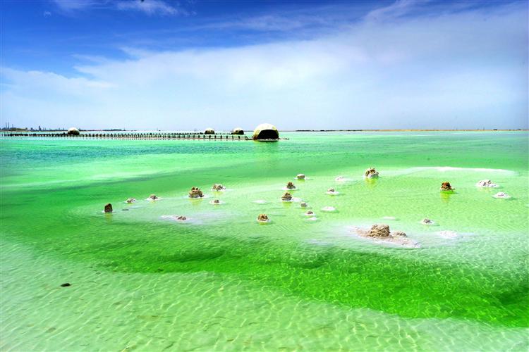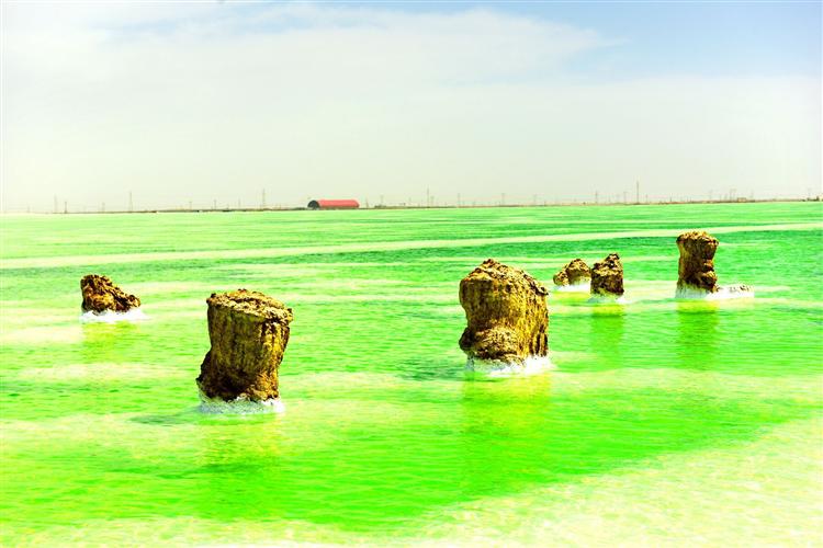 在察尔汗盐湖,因为盐水浓度大,一切生物都难以生长,没有树没有草没有昆虫,但是,它却孕育了另外一种晶莹玉润的神奇:盐花。这些盐花晶莹剔透,白玉无暇,在碧水蓝天下,一支支,一簇簇,一片片,以每年10到15公分左右的速度生长着。每当湖水退去,它就成片的显现出来。或如珍珠,或像珊瑚,或似飞禽走兽,或连成一片,若飞檐翘角、雕梁画栋的亭台楼阁。